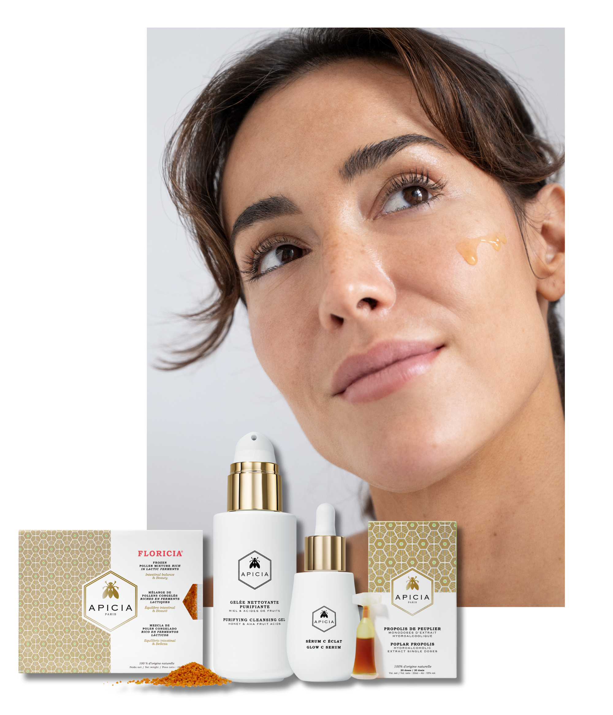 L’approche Apicia agit sur ces deux niveaux — l’inflammation systémique (In) & l’inflammation cutanée (Out) — grâce à la puissance anti-inflammatoire des produits de la ruche.