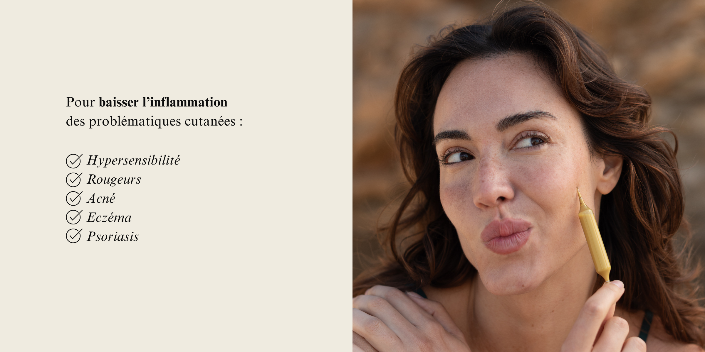 - Anti-inflammatoire : L’inflammation est un signal d’alarme de la plupart des maladies, et la base du développement de nombreuses maladies de peau. Une alimentation anti-inflammatoire (sans viandes rouges, laitages, sucres et alcool) associée à une prise de propolis permet d’assainir l’organisme et de diminuer la réponse cutanée.